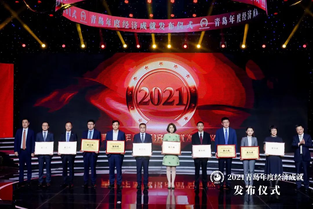 集團(tuán)常務(wù)副總裁張航(左七)出席2021青島年度經(jīng)濟(jì)成就獎(jiǎng)